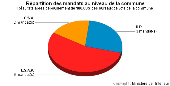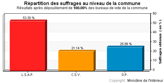 Les graphiques et tableaux publiés sur ce site sont évolutifs, c'est-à-dire qu'ils renseignent en permanence sur l'état actuel du scrutin. Ils ne constituent en aucun cas une projection vers un éventuel résultat final. Ils sont à considérer comme complets, quand la totalité des bureaux de vote a été prise en compte. Il s'agit de résultats officieux.